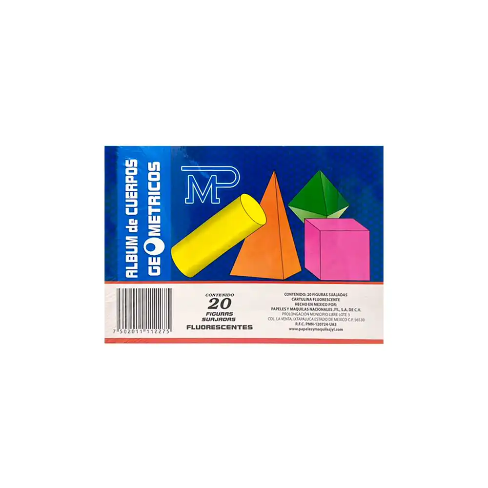 Álbum de cuerpos geométricos con 20 figuras suajadas fluorescentes. Ideal para enseñanza de geometría y aprendizaje visual en nivel básico.