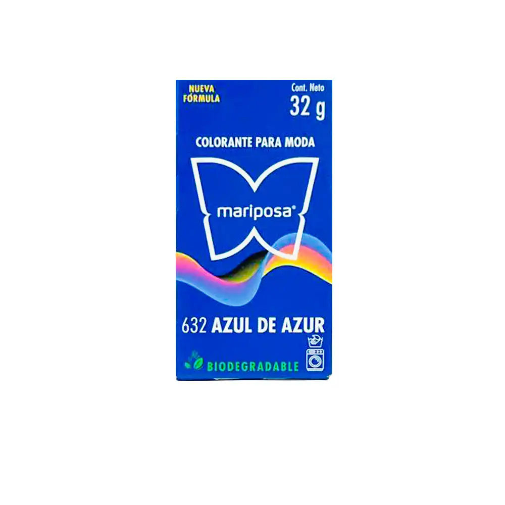 Renueva tus prendas favoritas con el colorante Mariposa, ideal para teñir ropa de forma uniforme y duradera. Su fórmula biodegradable cuida el medio ambiente sin comprometer la intensidad del color. Perfecto para telas naturales y sintéticas. Contenido neto de 32 g, fácil de aplicar en casa.