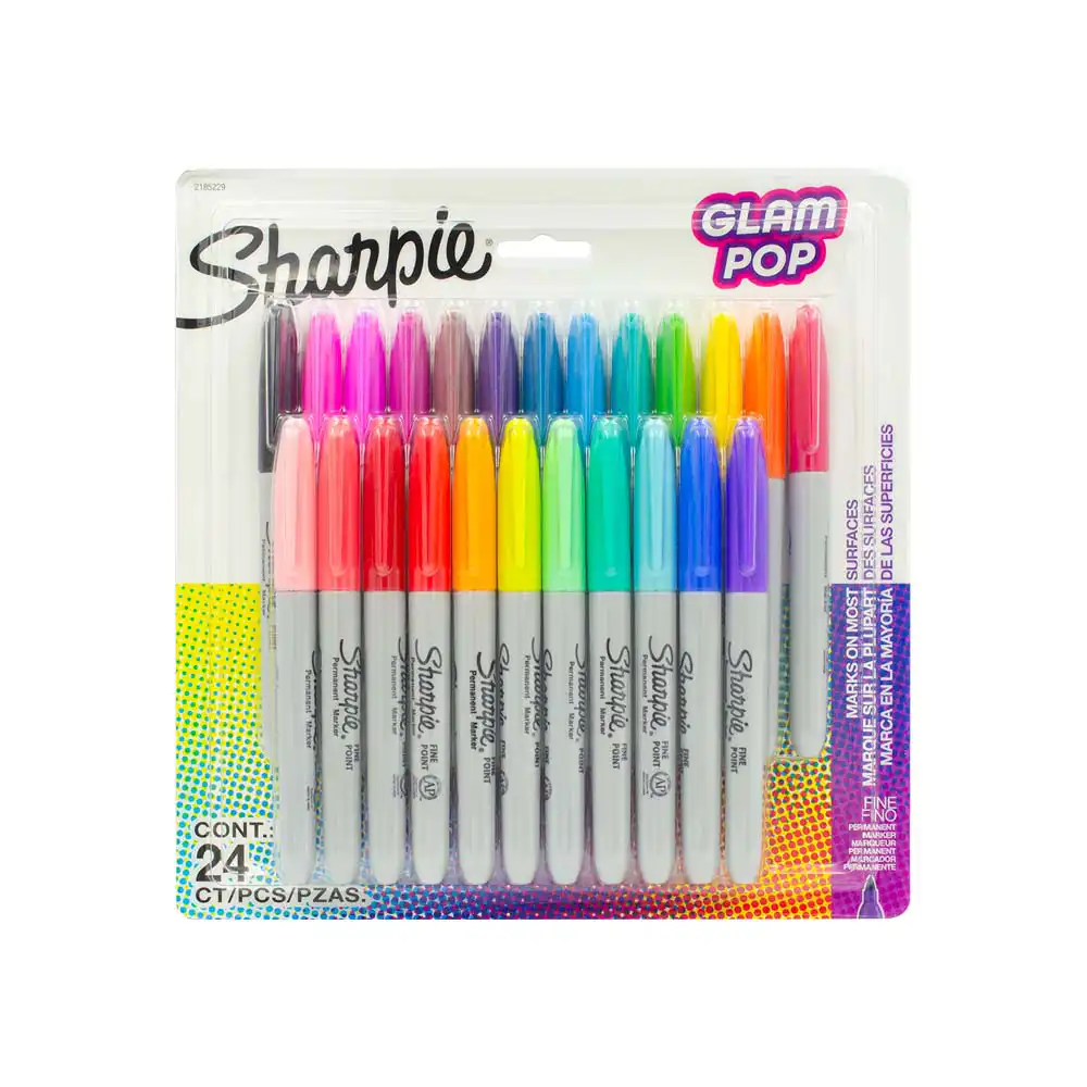 Set de 24 marcadores permanentes Sharpie Glam Pop con punta fina, en colores vibrantes y llamativos para superficies múltiples. Perfectos para destacar tus ideas con estilo.