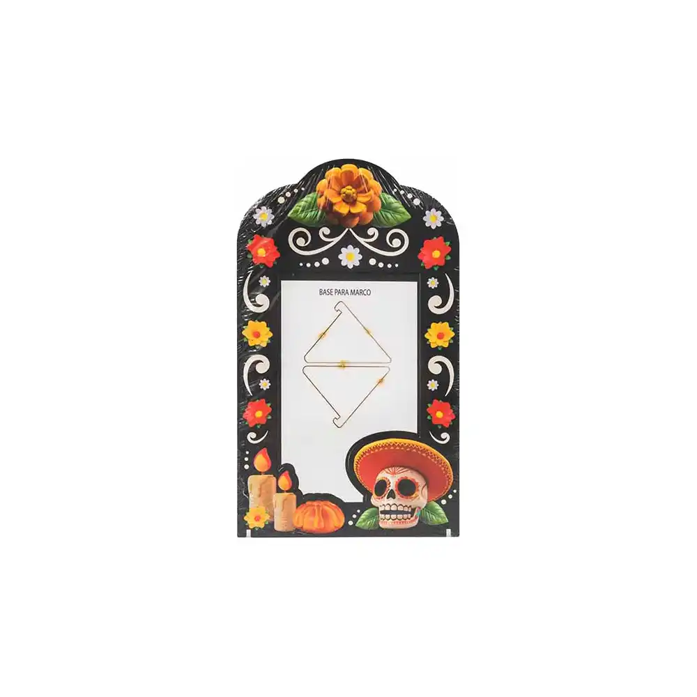 Marco decorativo para ofrenda de Día de Muertos con diseño tradicional de calavera, flores de cempasúchil y veladoras. Ideal para colocar fotografías en altares o espacios conmemorativos.