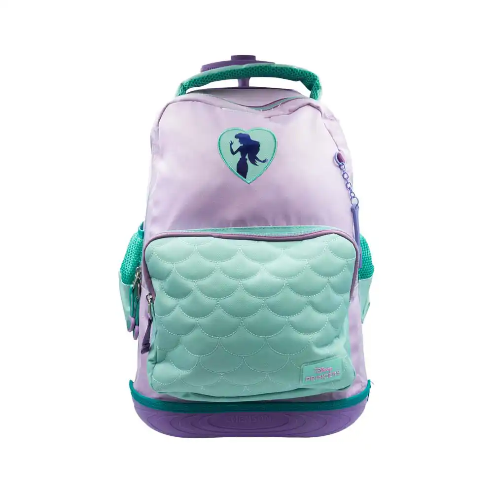 Mochila escolar con ruedas en tonos pastel, diseño de silueta de Ariel y textura escamada.