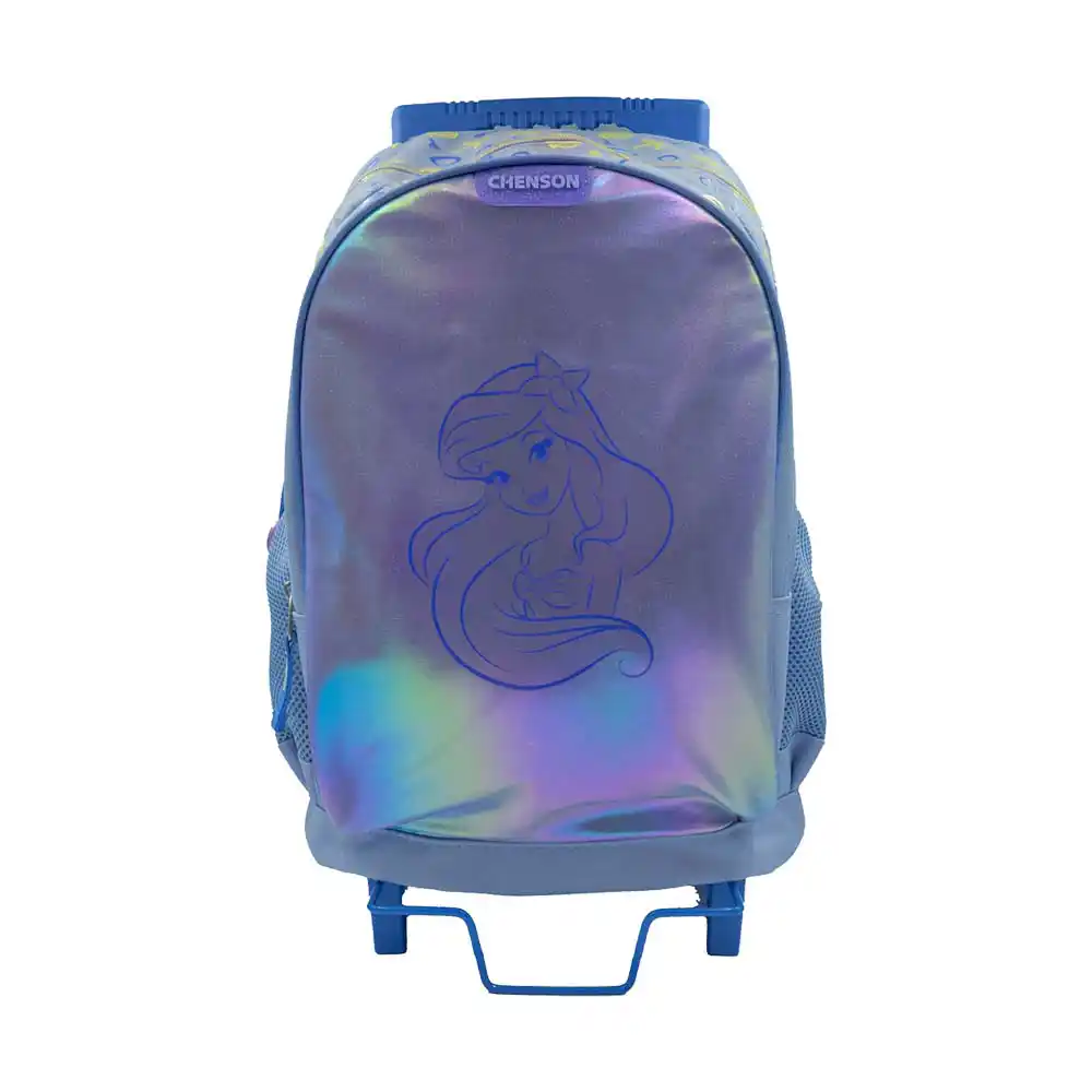 Mochila con efecto tornasol y diseño de Ariel. Moderna y espaciosa, perfecta para niñas con estilo. Incluye ruedas y tirantes ajustables.