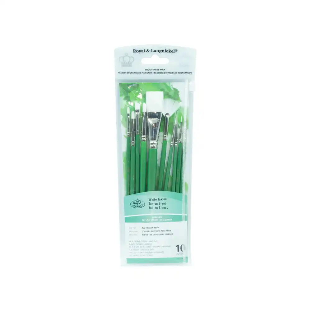 Set de 10 pinceles White Taklon Royal & Langnickel para todo tipo de pintura: óleo, acuarela, acrílico y más. Cerdas sintéticas resistentes para trazos suaves y definidos. Ideal para artistas de todos los niveles.