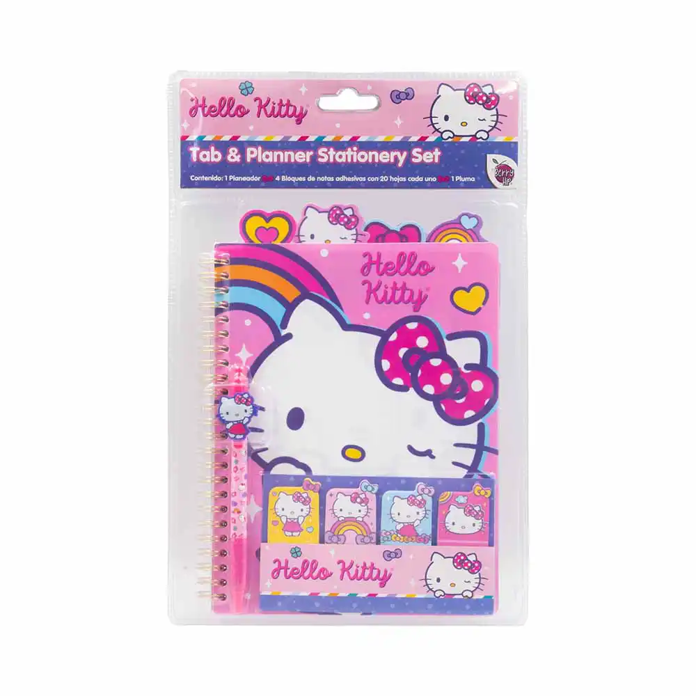 Organiza tus días con el adorable set de papelería Kitty. Incluye un planeador con espiral, 4 bloques de notas adhesivas y una pluma decorada. Ideal para planear tareas o escribir notas.