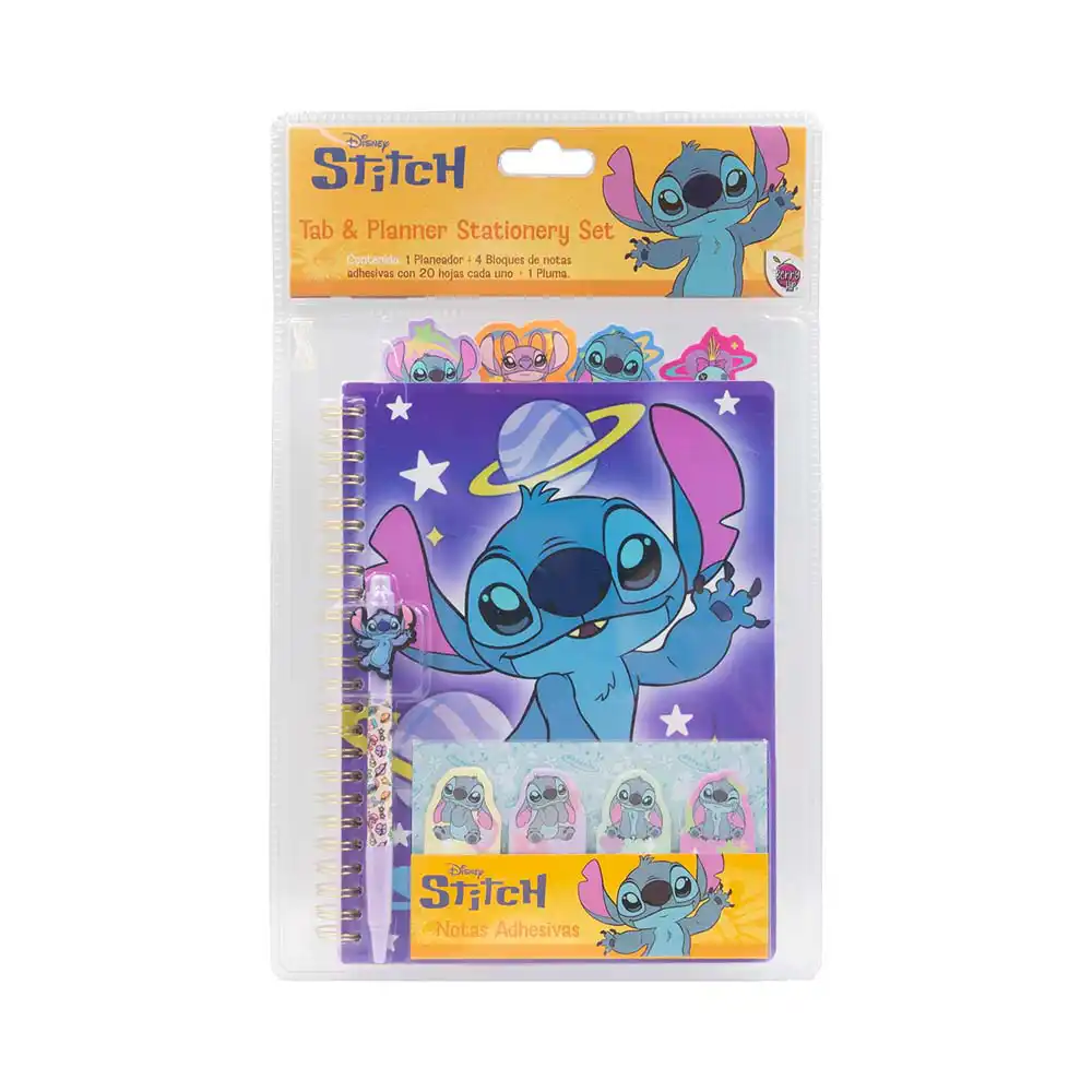 Organiza tus días con el adorable set de papelería Stitch. Incluye un planeador con espiral, 4 bloques de notas adhesivas y una pluma decorada. Ideal para planear tareas o escribir notas.