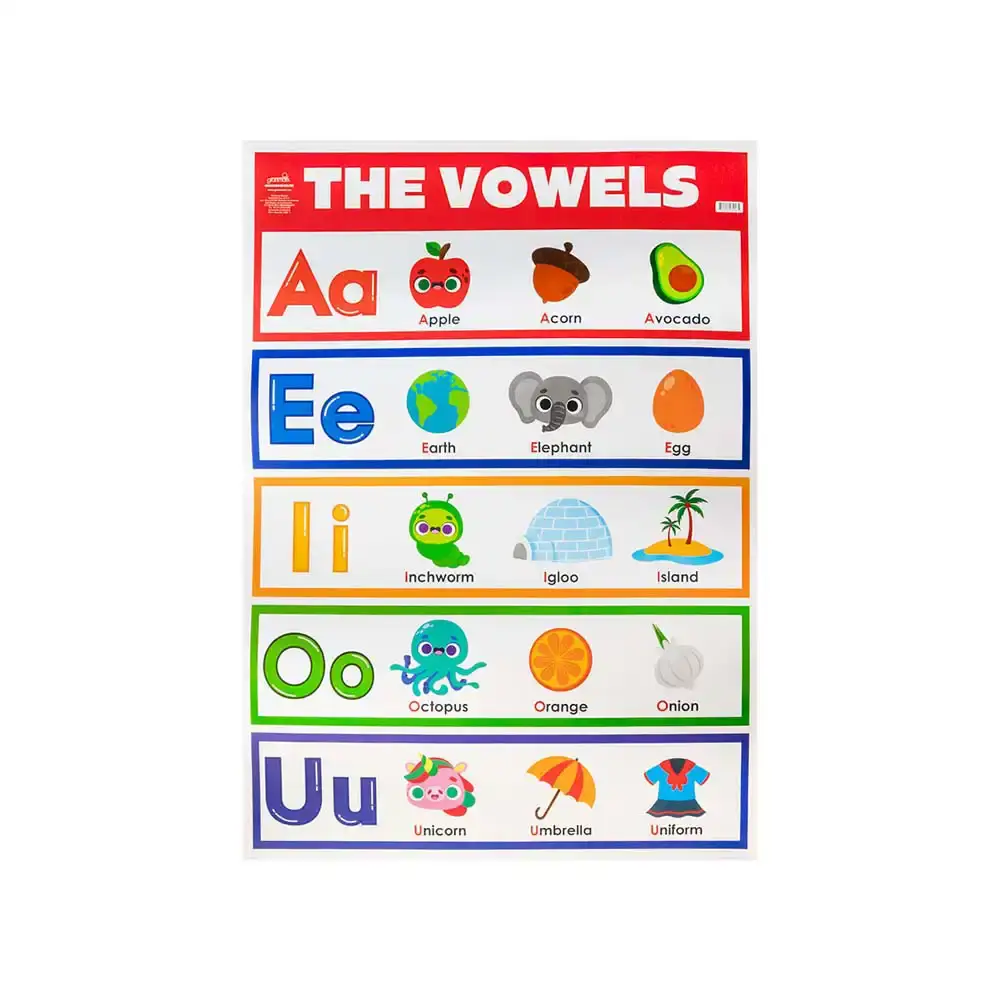 Aprende las vocales en inglés de forma divertida con este colorido cartel educativo. Ideal para preescolar y primaria, con ilustraciones llamativas.